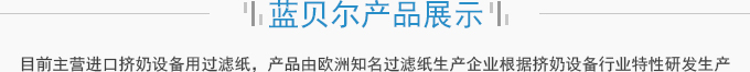 濟(jì)南藍(lán)貝爾工貿(mào)有限公司主要產(chǎn)品擠奶設(shè)備過濾紙,牛奶過濾紙,擠奶機(jī)過濾袋,目前主營(yíng)進(jìn)口擠奶設(shè)備用過濾紙,產(chǎn)品由歐洲知名過濾紙生產(chǎn)企業(yè)根據(jù)擠奶設(shè)備行業(yè)特性研發(fā)生產(chǎn),產(chǎn)品符合歐盟食品接觸標(biāo)準(zhǔn)及FDA食品接觸標(biāo)準(zhǔn),產(chǎn)品在擠奶設(shè)備過濾紙行業(yè)占有70%以上的份額。并通過了SGS標(biāo)準(zhǔn)技術(shù)檢測(cè)中心按國(guó)標(biāo)食品級(jí)標(biāo)準(zhǔn)進(jìn)行的檢測(cè)。產(chǎn)品適用于各種擠奶設(shè)備品牌,本公司目前獲得該區(qū)域產(chǎn)品營(yíng)銷資格。產(chǎn)品已用于國(guó)內(nèi)各大乳企所屬牧...